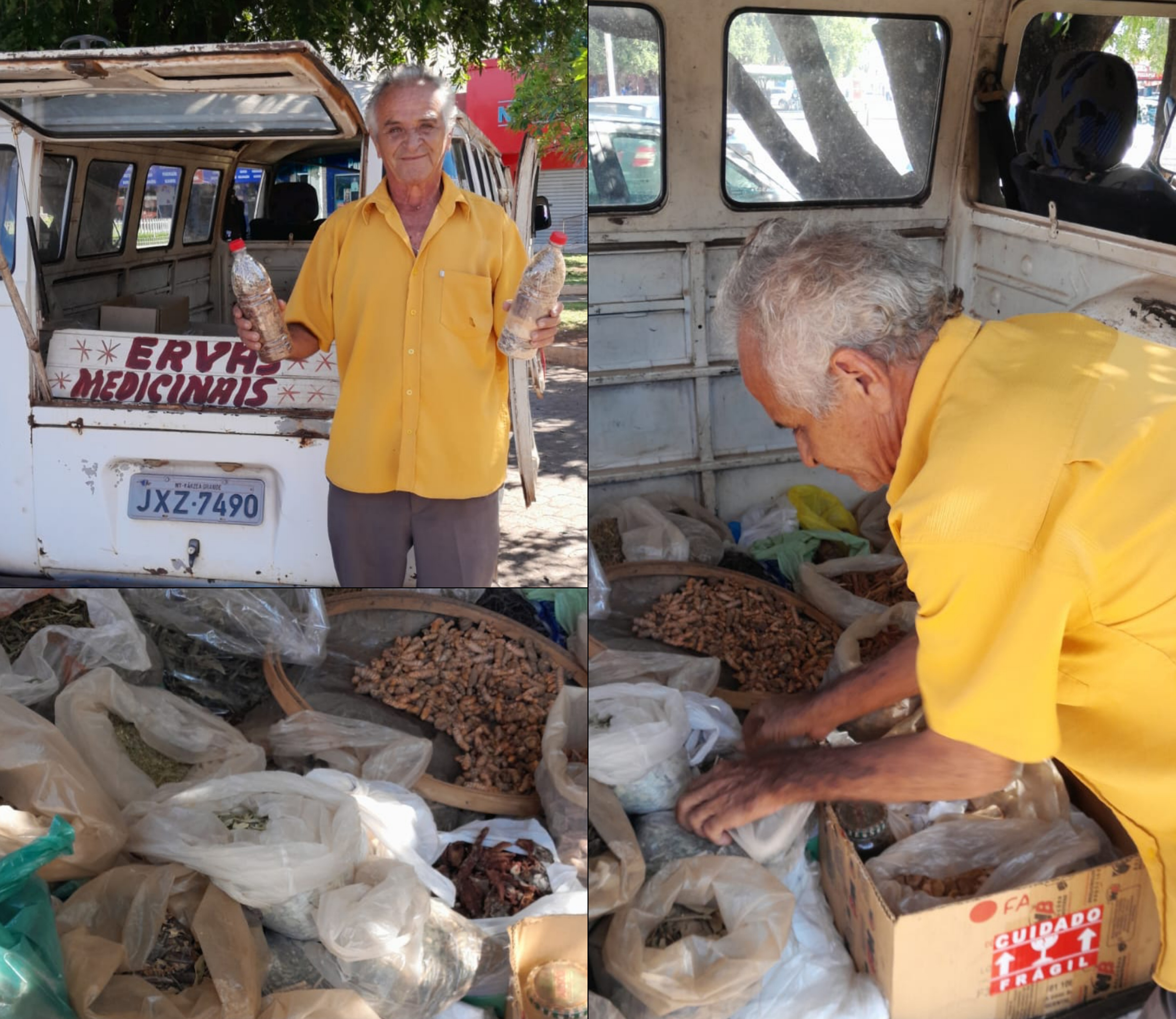 Há 36 anos, José Gomes do Prado, de 66 anos, vende medicamentos naturais na Praça da Igreja Matriz Nossa Senhora do Carmo, em Várzea Grande (MT). Desde os 7 anos, ele aprendeu com o pai, um curandeiro, e a mãe, uma parteira, sobre as propriedades medicinais das plantas.