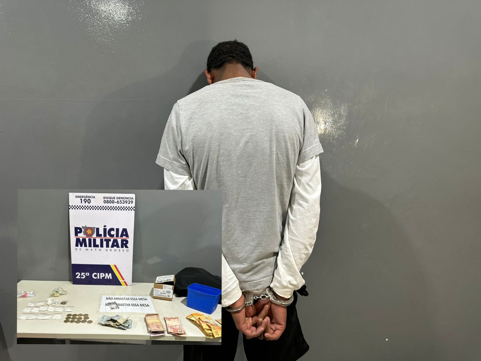 Com ele, foi encontrada uma pequena porção de drogas. Ao realizar buscas na residência, os militares localizaram o restante dos entorpecentes escondidos no forro do imóvel, além de R$ 808 em dinheiro trocado, característico do tráfico.