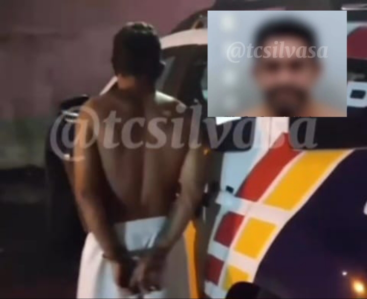 Após a abertura do portão, o suspeito foi detido e encaminhado à 1ª Delegacia de Polícia com uso de algemas.