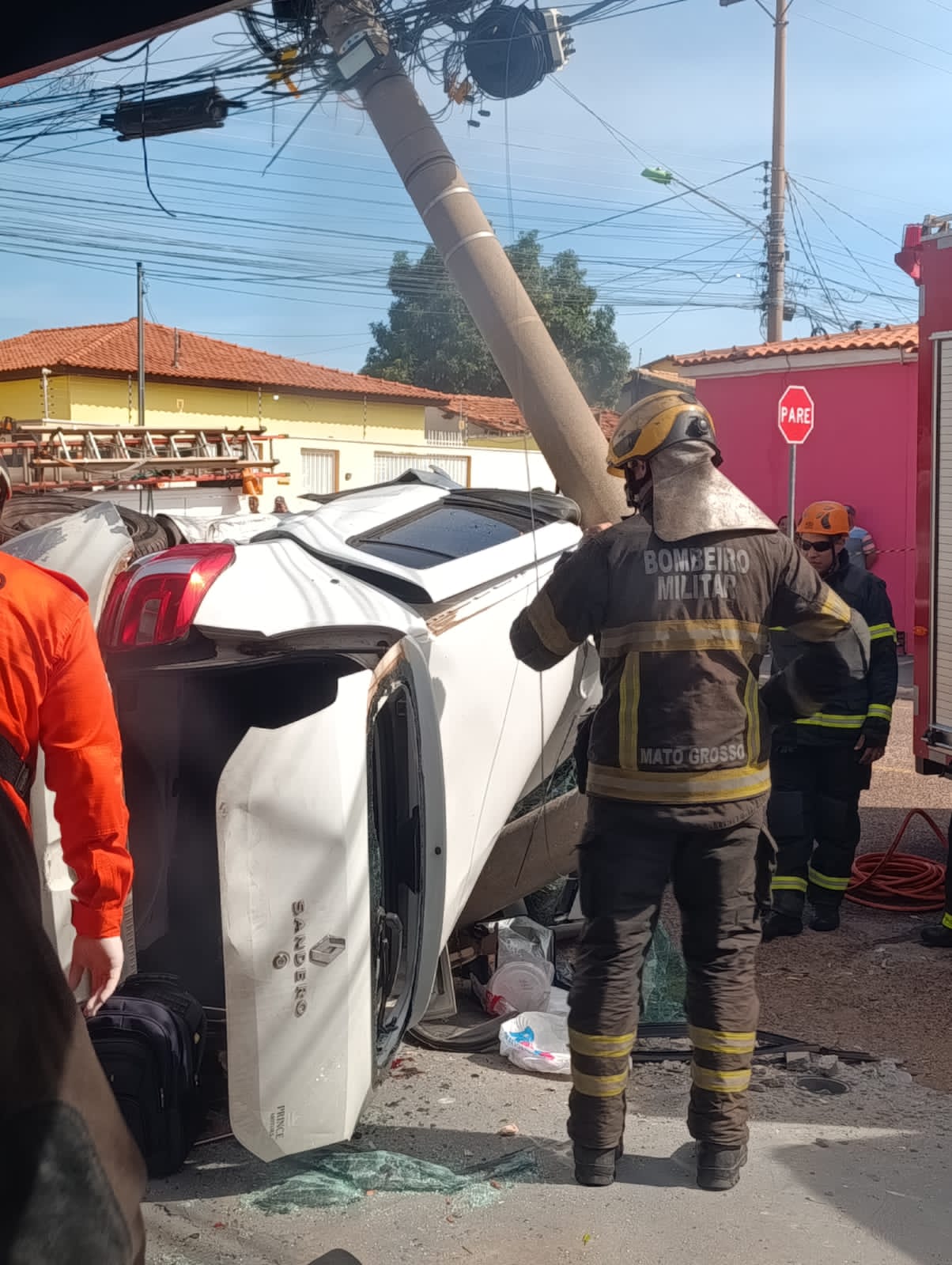 O impacto fez com que o Sandeiro capotasse e colidisse contra um poste de energia elétrica.