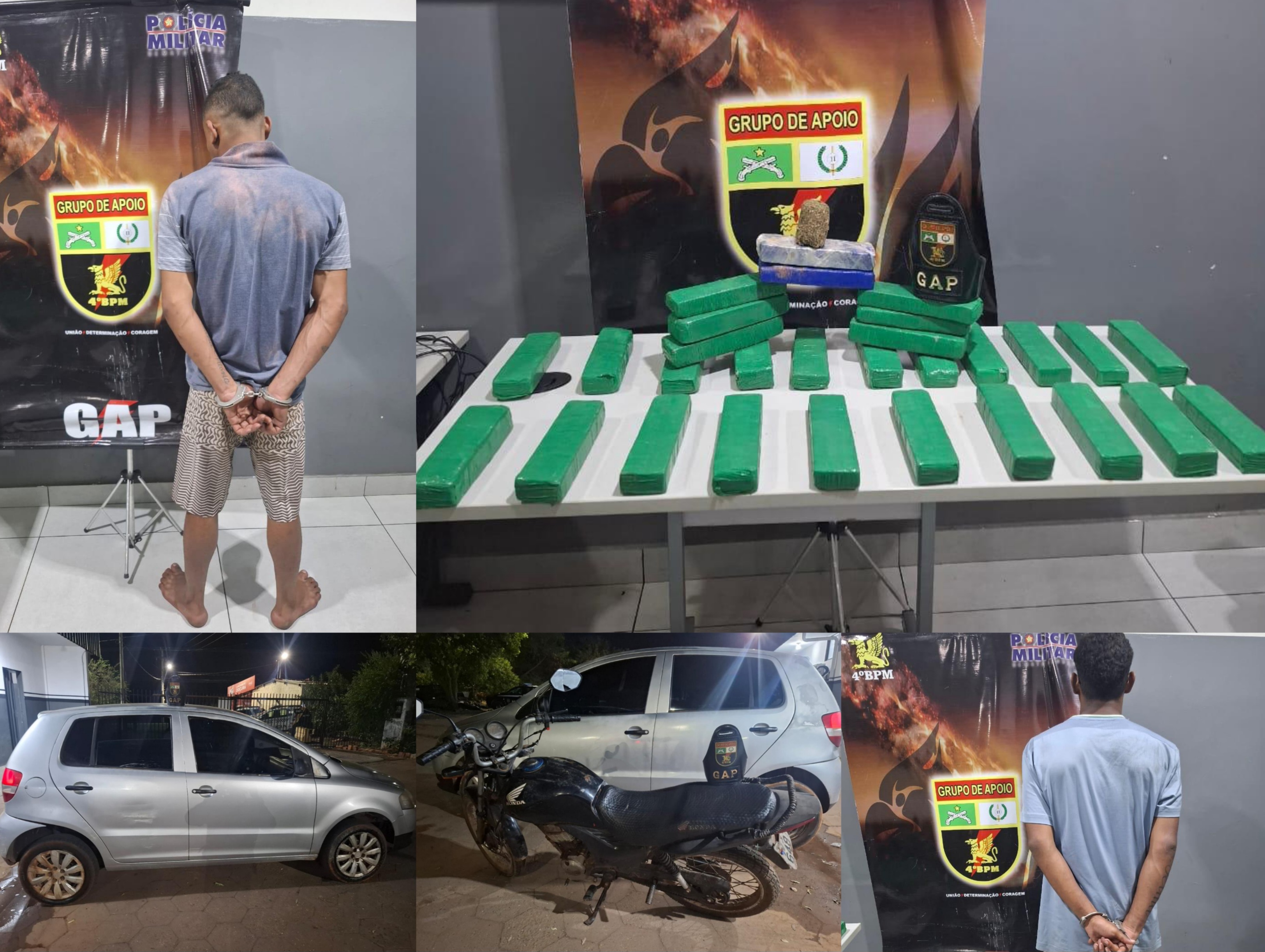 Material apreendido: 29 tabletes de substância análoga a maconha, 1 porção adicional, veículo VW Fox, motocicleta (produto de furto).