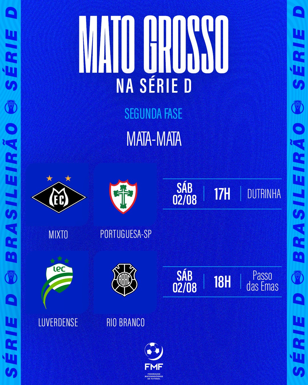 Os dois representantes de Mato Grosso entram campo neste sábado (02) para o mata-mata da Série D do Brasileirão. Mixto e Luverdense abrem os confrontos da segunda fase em casa, buscando vantagem nos duelos de ida diante dos adversários.