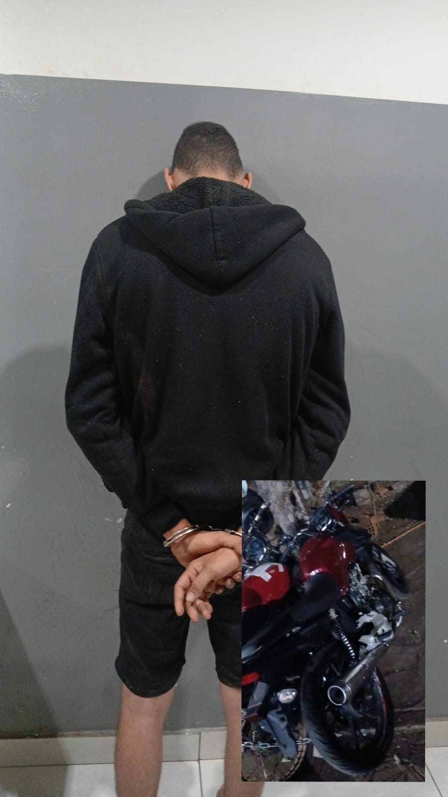 Após companhamento acabou sendo detido. Durante a abordagem, os GM’s constataram que a placa do veículo estava escondida sob o moletom do motociclista, junto ao corpo.