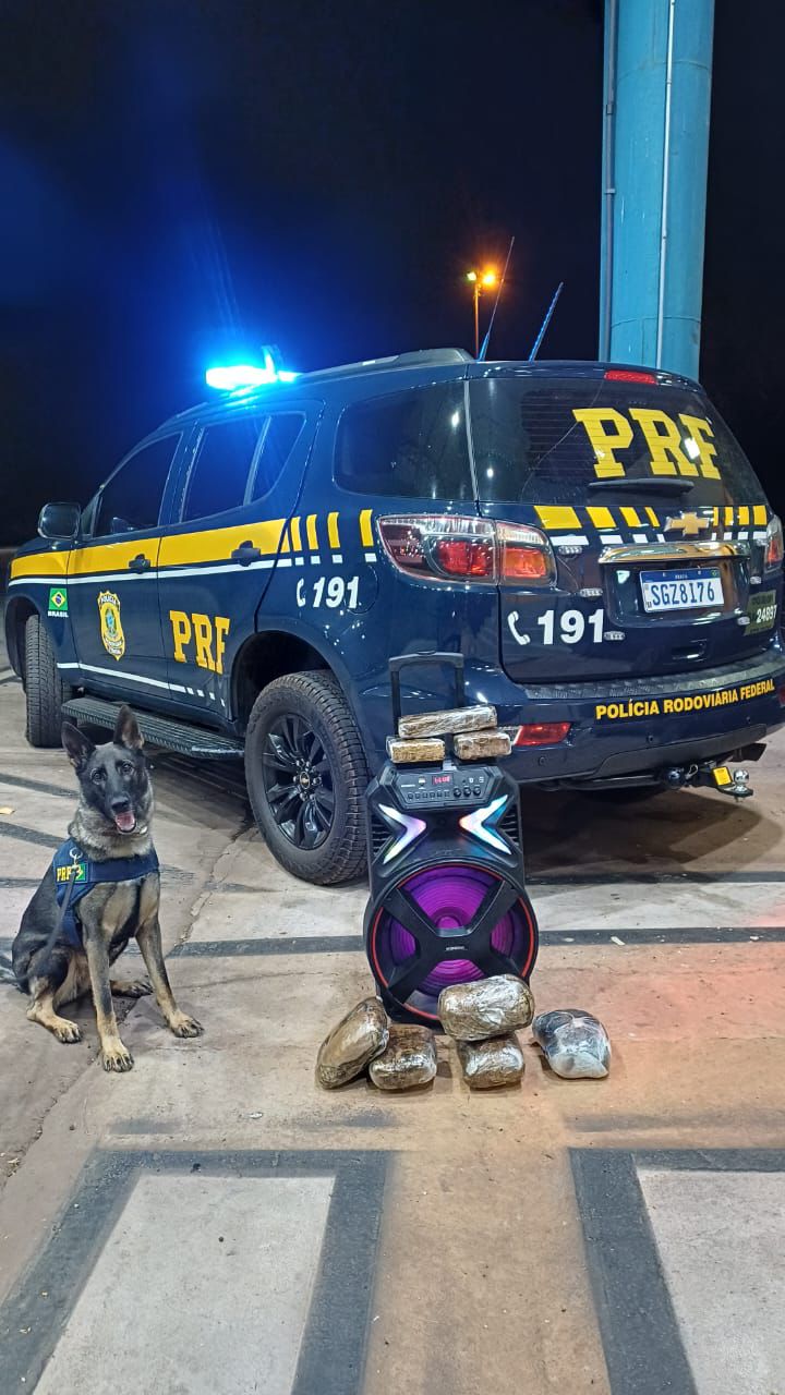 Com o apoio de um cão farejador, os policiais localizaram cerca de 8 quilos de maconha do tipo skunk, droga de alto valor comercial, escondidos dentro de uma caixa de som.