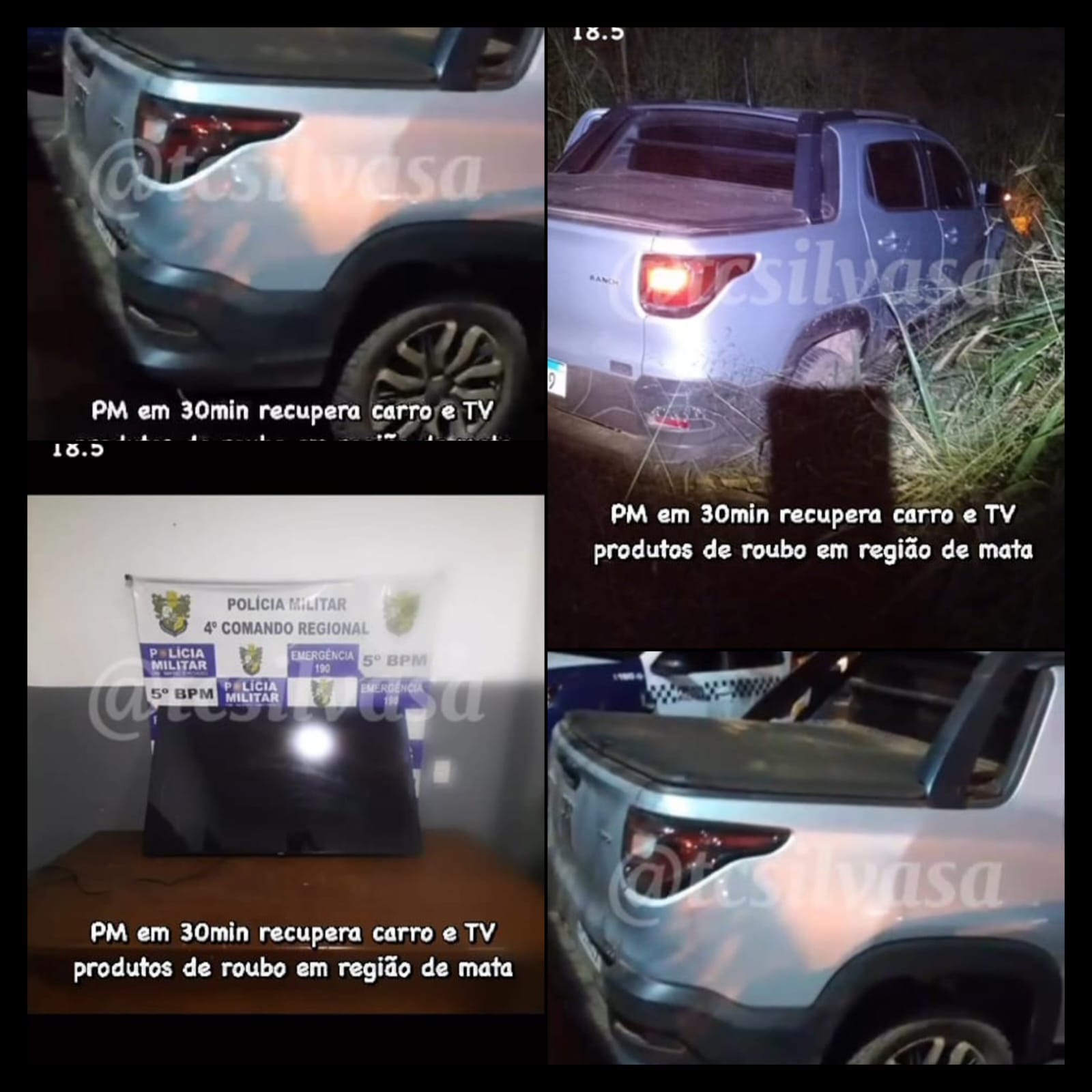 Após alguns minutos de diligência, os policiais do 5º BPM lograram êxito em recuperar o veículo Fiat/Strada, a televisão e demais produtos roubados, localizados em uma área de mata.