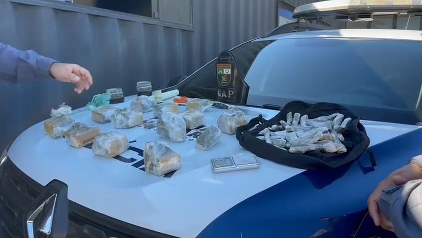 Foram apreendidos 12 porções grandes análogas à maconha, 47 porções médias análogas à maconha, 1 porção análoga a ácido bórico, 1 balança de precisão, 2 celulares, 1 papel filme, 1 tesoura e 2 potes de plástico contendo maconha.