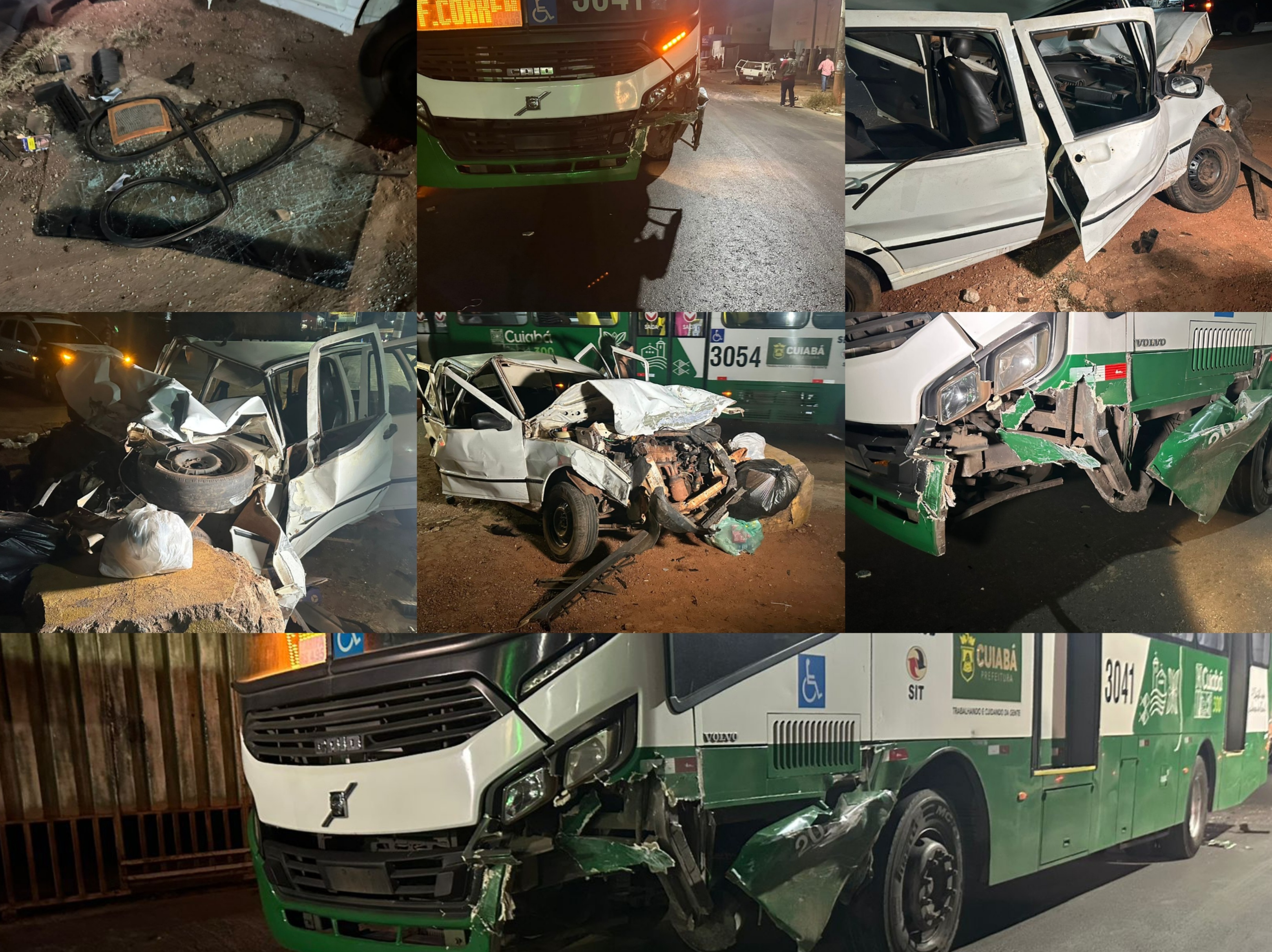 Um carro de passeio ficou completamente destruído após bater em um ônibus e atingir um bloco de concreto, na noite deste domingo (3), no bairro Industriário, em Cuiabá.
