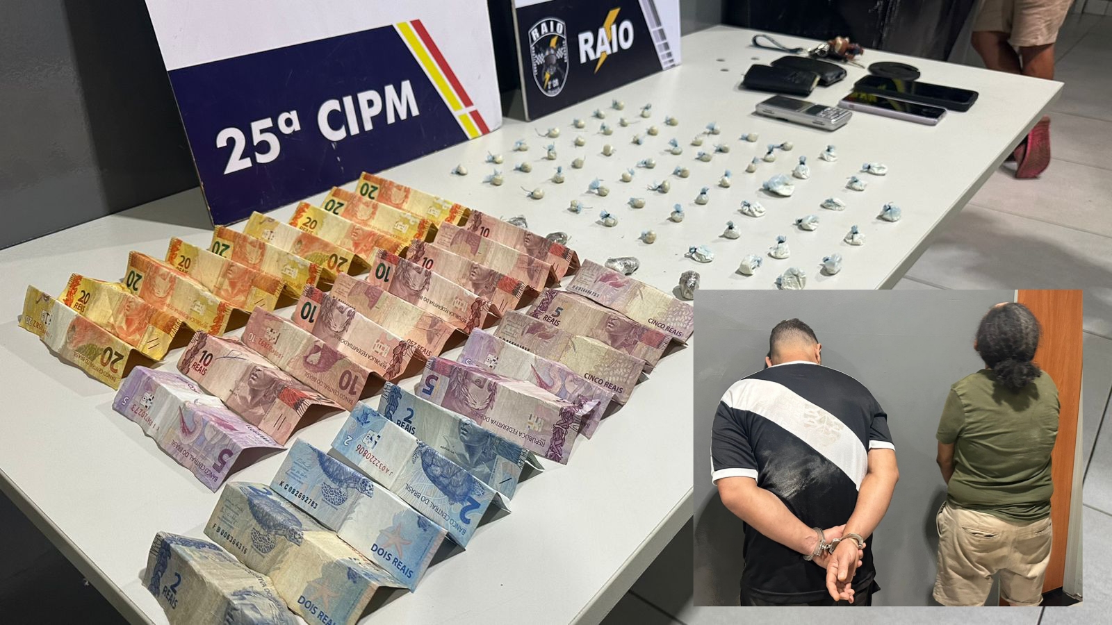 Os policiais constataram movimentação suspeita e flagraram um homem identificado como Elias recebendo porções das mãos de uma mulher, identificada como Cristina.
